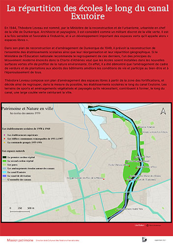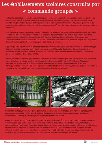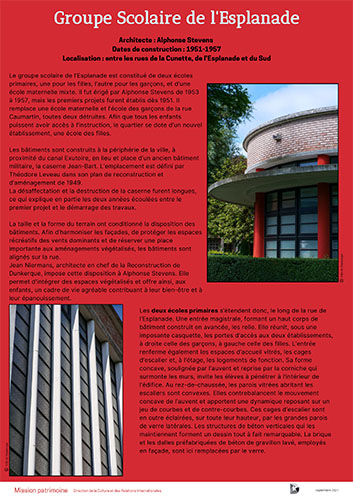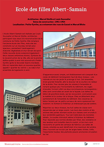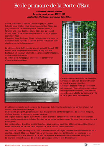 A Dunkerque, pas une seule école n’a survécu aux bombardements. Mais dès 1950, alors que la ville renaît doucement de ses cendres et que les tous premiers logements sont livrés aux sinistrés, Jean Niermans, architecte en chef de la reconstruction de la ville, alerte les autorités et demande à faire de la reconstruction des établissements scolaires une priorité. Les premiers projets débutent dès 1951 et, jusqu’en 1960, plus de dix bâtiments ouvriront leurs portes aux jeunes écoliers.