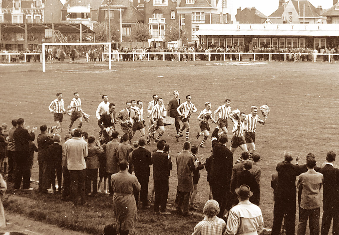 Il faut donc repartir de zéro à la Libération. On installe une tribune provisoire et des baraquements en guise de vestiaires. Pour son premier match de championnat d’après-guerre, Le 3 septembre 1945, l’Olympique Dunkerquois domine les Cheminots de Boulogne devant 500 spectateurs juchés sur les ruines.
