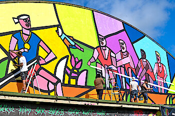 La création d’un parcours d’arts urbains au cœur de Petite-Synthe contribue à valoriser le patrimoine existant et mettre en récit visuellement l’identité du quartier et à rendre les habitants fiers d’habiter Petite-Synthe. Le parcours d’art urbain met de la couleur dans le quartier et crée du lien entre les habitants, invités à s’investir dans cette démarche artistique.
