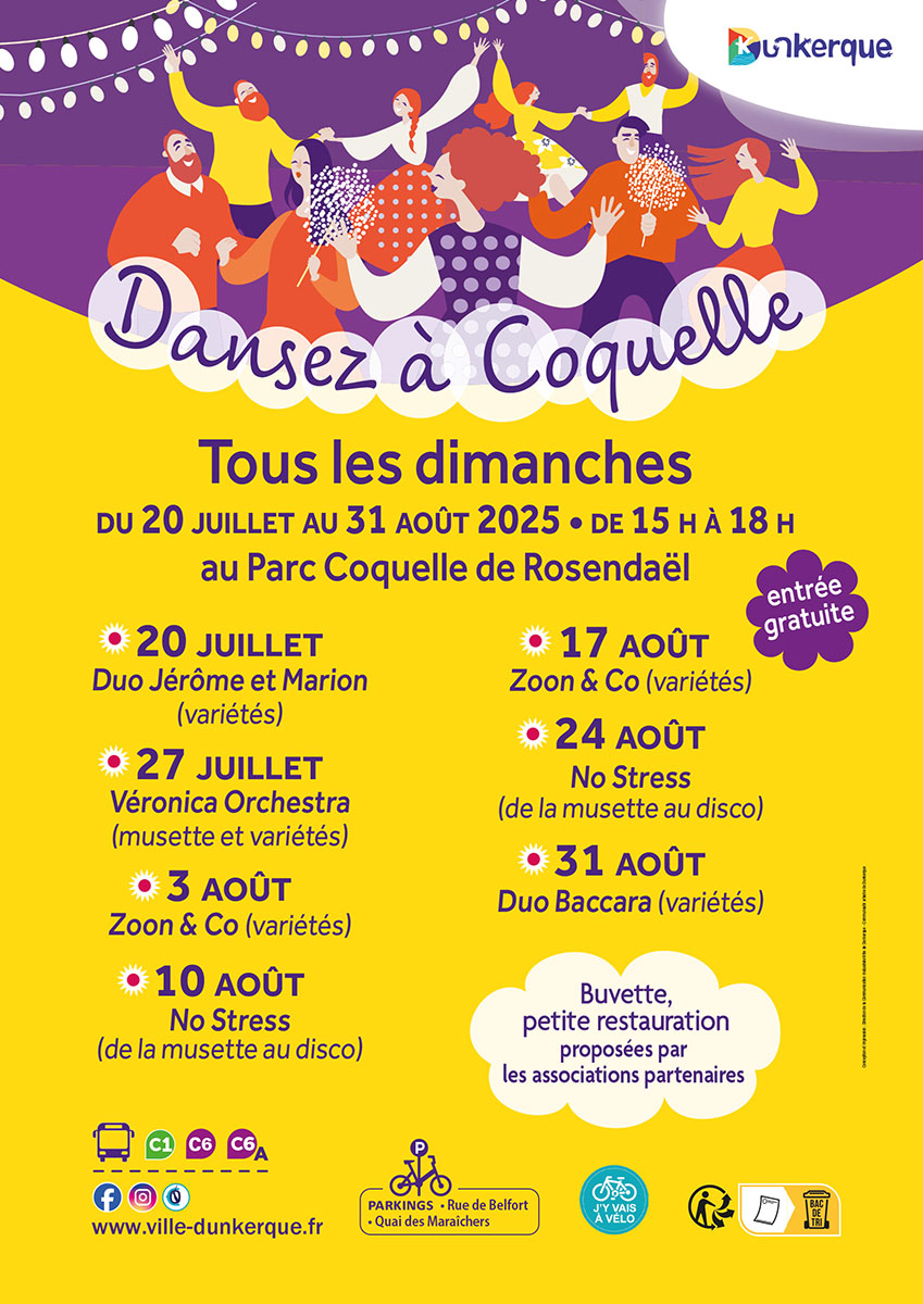 Du 20 juillet au 31 août, l’événement « Dansez à Coquelle ! » vous donne rendez-vous chaque dimanche après-midi pour des heures de danse, de sourire et de partage dans l’écrin verdoyant et rafraichissant du parc Coquelle à Rosendaël.